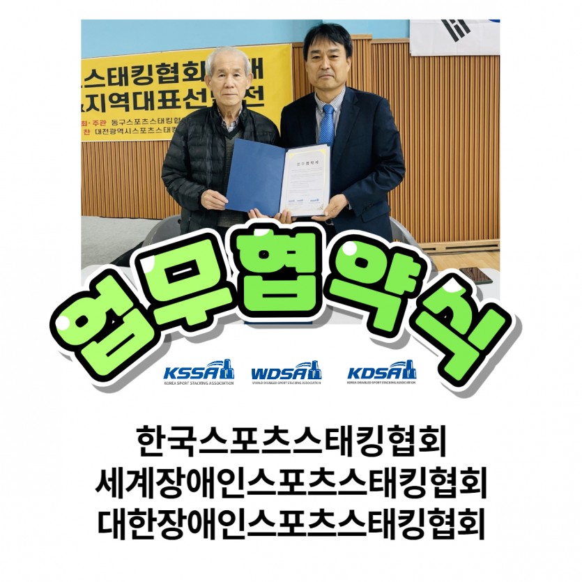 지난 4월 15일 토요일 대전 성남다목적체육관에서 한국스포츠스태킹협회는 세계장애인스포츠스태킹협회, 대한장애인스포츠스태킹협회와 협약식을 체결했습니다. 이를 통해 스포츠스태킹 저변확대를 위해 각 협회가 상호 협력하기로 했습니다. 이번 협약으로 더많은 장애인 분들도 스포츠스태킹을 즐길 수 있게 되었습니다.