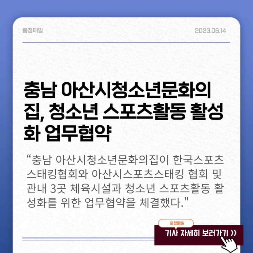 매스컴 보도 [충청매일]충남 아산시청소년문화의집, 청소년 스포츠활동 활성화 업무협약